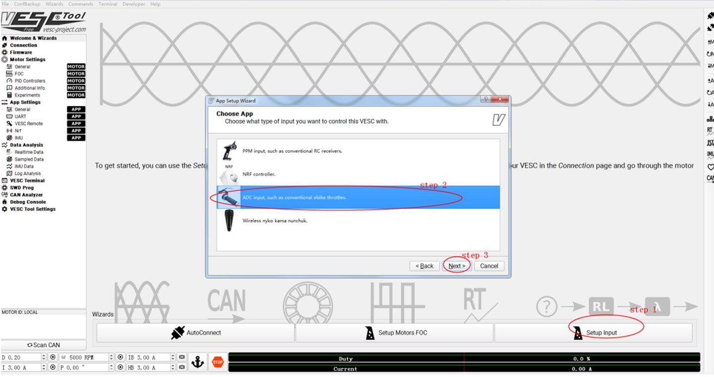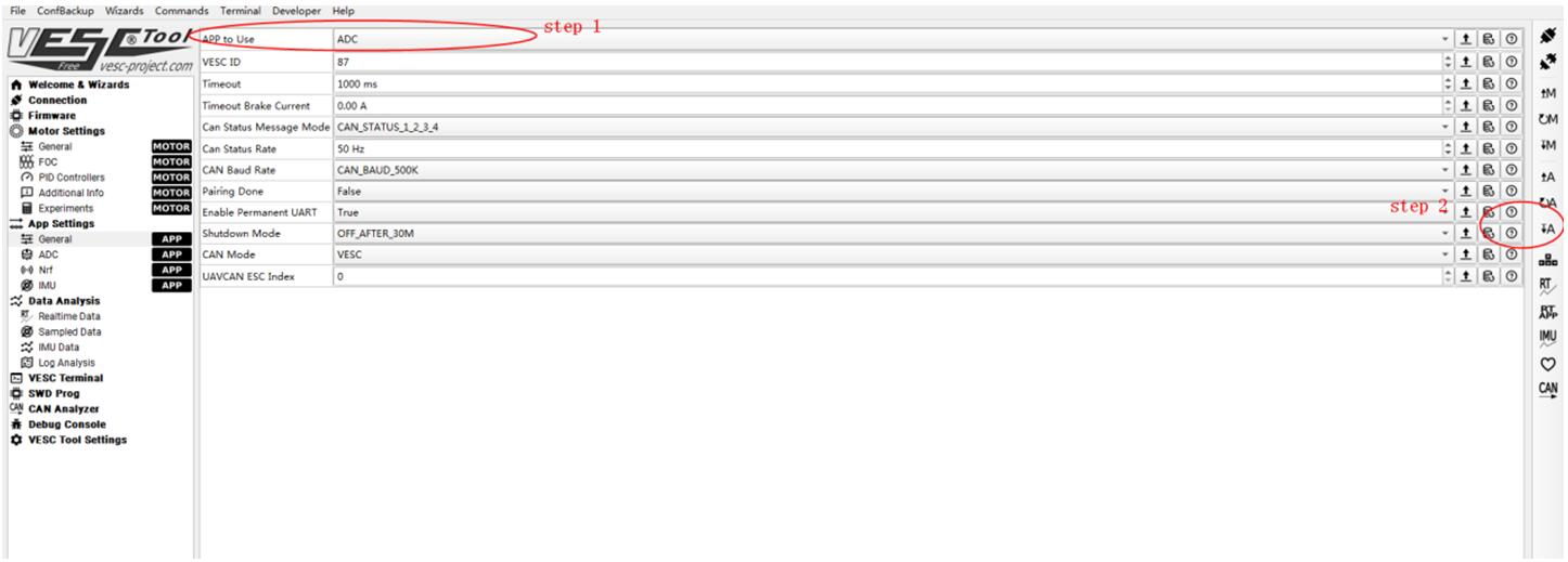 ADC controller :ADC terminal-ESC ADC, ESC ADC2 remains unchanged, vesc tool selects “Current”mode. |