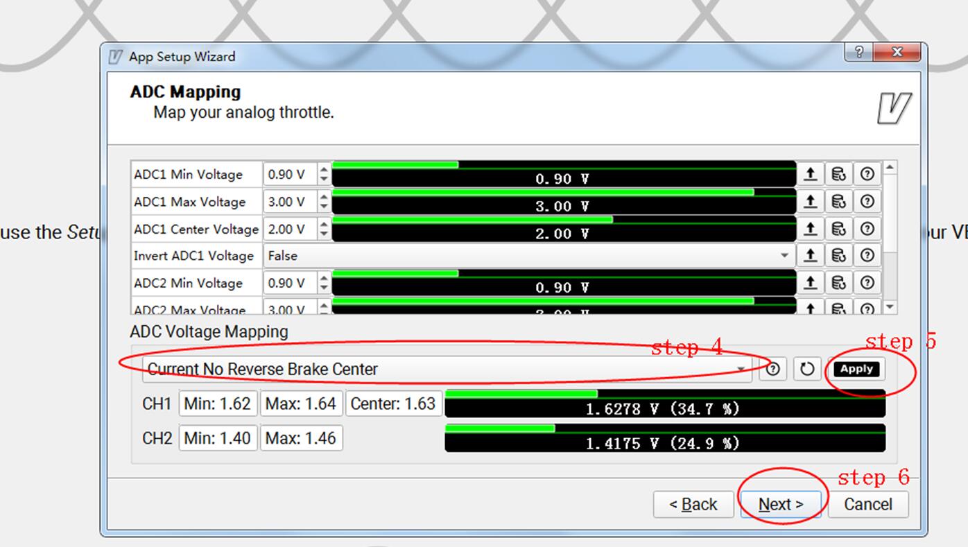 (4)Choose the mode “Current No Reverse Brake Center”--Push&Pull the throttle to Max--Click”Apply”--Next