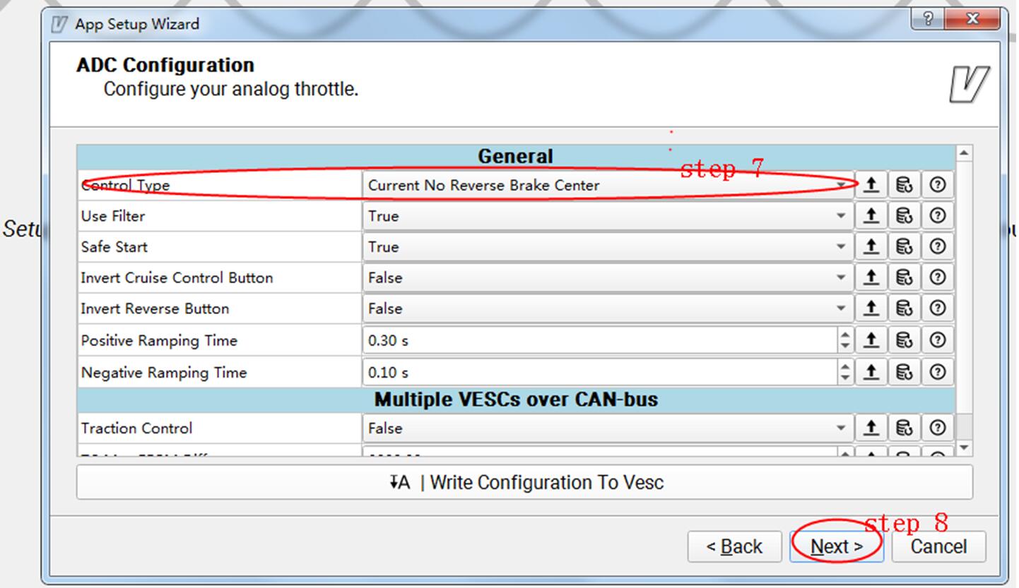 ADC controller: ADC terminal-ESC ADC, ESC ADC2 remains unchanged, vesc tool selects “Current Reverse Center”mode. |